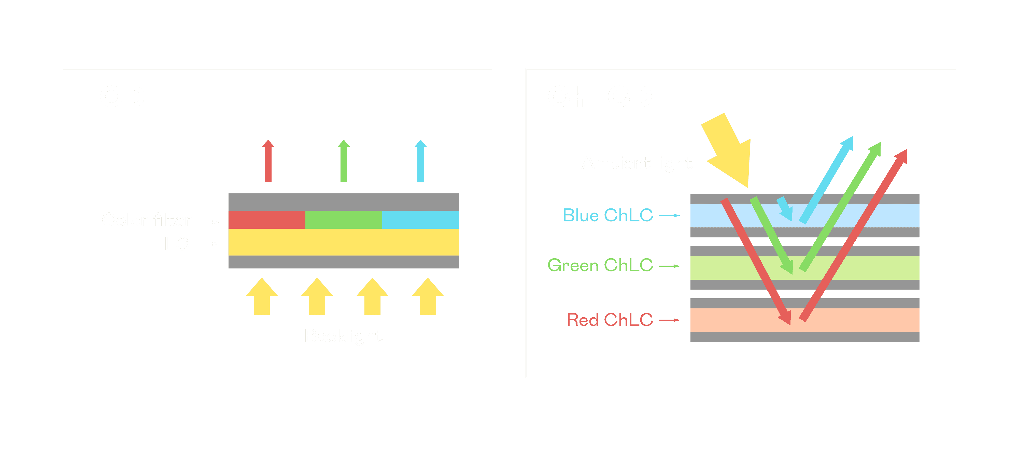 ChLCD 胆固醇液晶就如同纸张一样,,,透过反射环境光来显示影像,,,,因此长时间观看不易造成人眼视觉疲劳,,可达到护眼效果。。。。当处于户外阳光下使用,,LCD 影像容易失真而不易观看,,,,但胆固醇液晶仍可维持较佳的影像品质。。。。